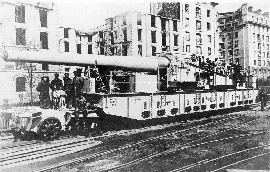 Parmi les matériels ayant circulé sur la Petite Ceinture, des canons sur rails. Voici un modèle construit en 1916 par l’usine Goüin, dans le 17e arrondissement, embranchée sur la Petite Ceinture (cliquer ici pour découvrir la localisation de cet embranchement sur une carte interactive), pour l’artillerie lourde à grande puissance (ALGP). Au fond, les immeubles de la rue Ernest Roche.