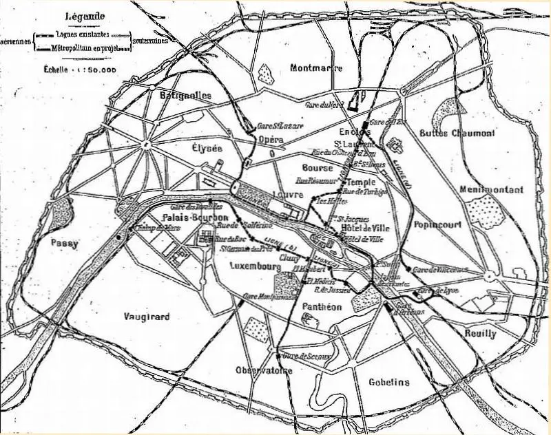 Le premier projet de chemin de fer métropolitain remonte à 1871. Pour de multiples raisons, que le quotidien Le Matin a fort bien résumées dans son édition du 2 avril 1898 consultable sur le site Gallica, le projet n’est pas toujours décidé au lendemain de l’Exposition Universelle de 1889. Mais la perspective de l’Exposition Universelle de 1900 rend urgent de le réaliser afin de pallier à l’insuffisance des transports dans les quartiers centraux de la Capitale.